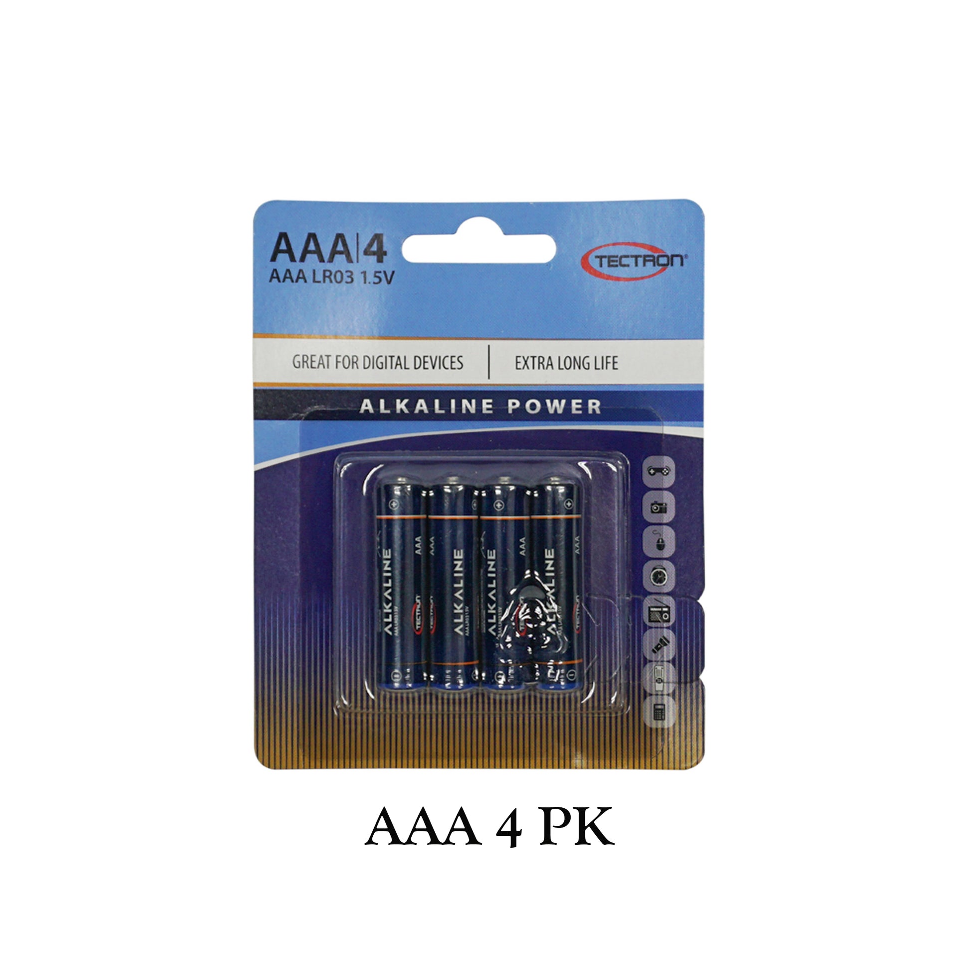 Great for digital devices. This 4-piece Tectron AAA Alkaline Power Batteries Set features extra long-life batteries. Each battery holds 1.5V of power, and are traditionally shaped with a positive and negative end. Four come packaged in a blister pack