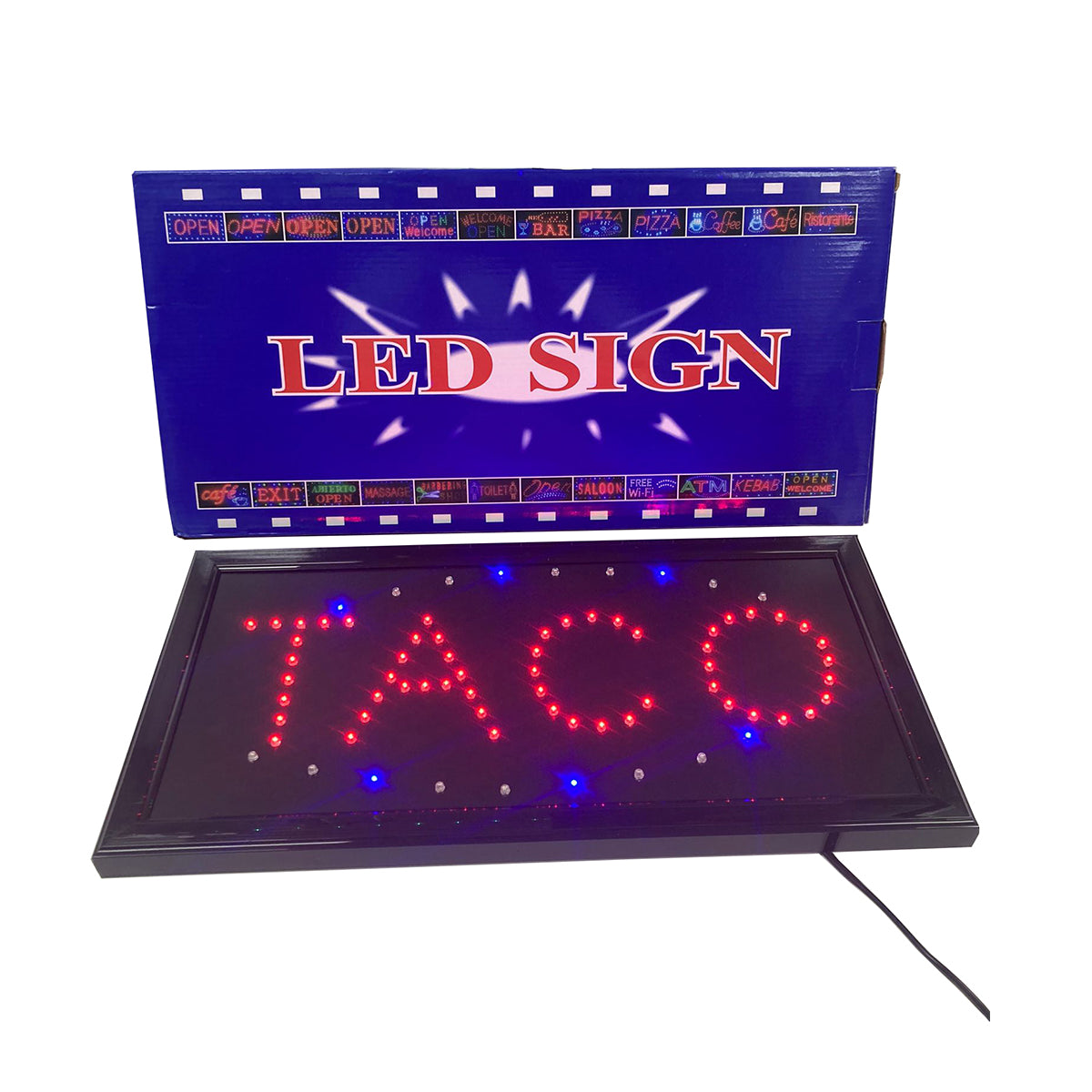 Features:Sign: TacoPower: 110VABS Body DesignLED Lifetime: Over 100,000 HoursAnimated Mode : “TACO" Blue & Red LED Lights Steady ShinningHang Up with 2 Build in Hanger loops Dimensions: 22" x 13" x 1.5" (LxWxD)Power Cord Length: 52“With ON/OFF swtich