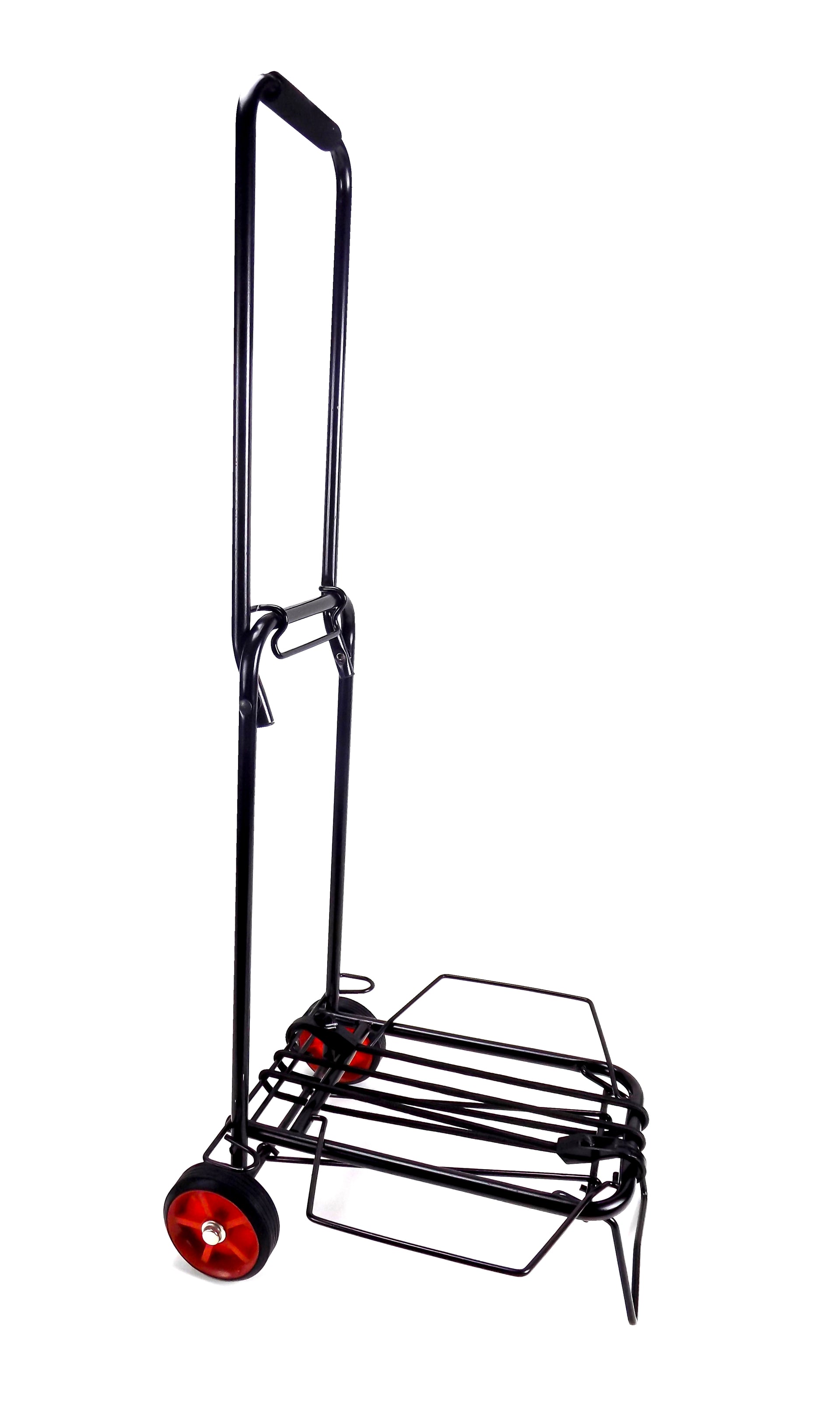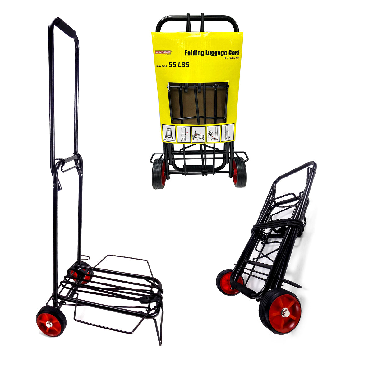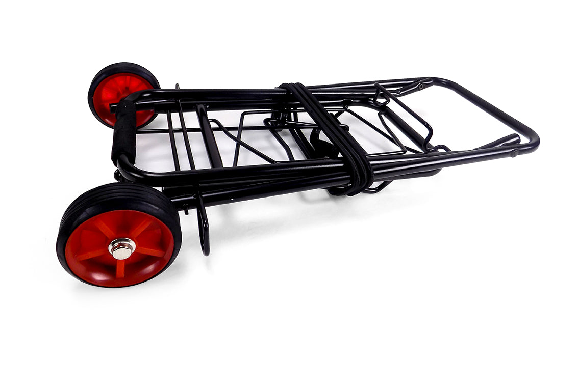 Metal black luggage cart with securing straps. Great for safe and secure transport of luggage.