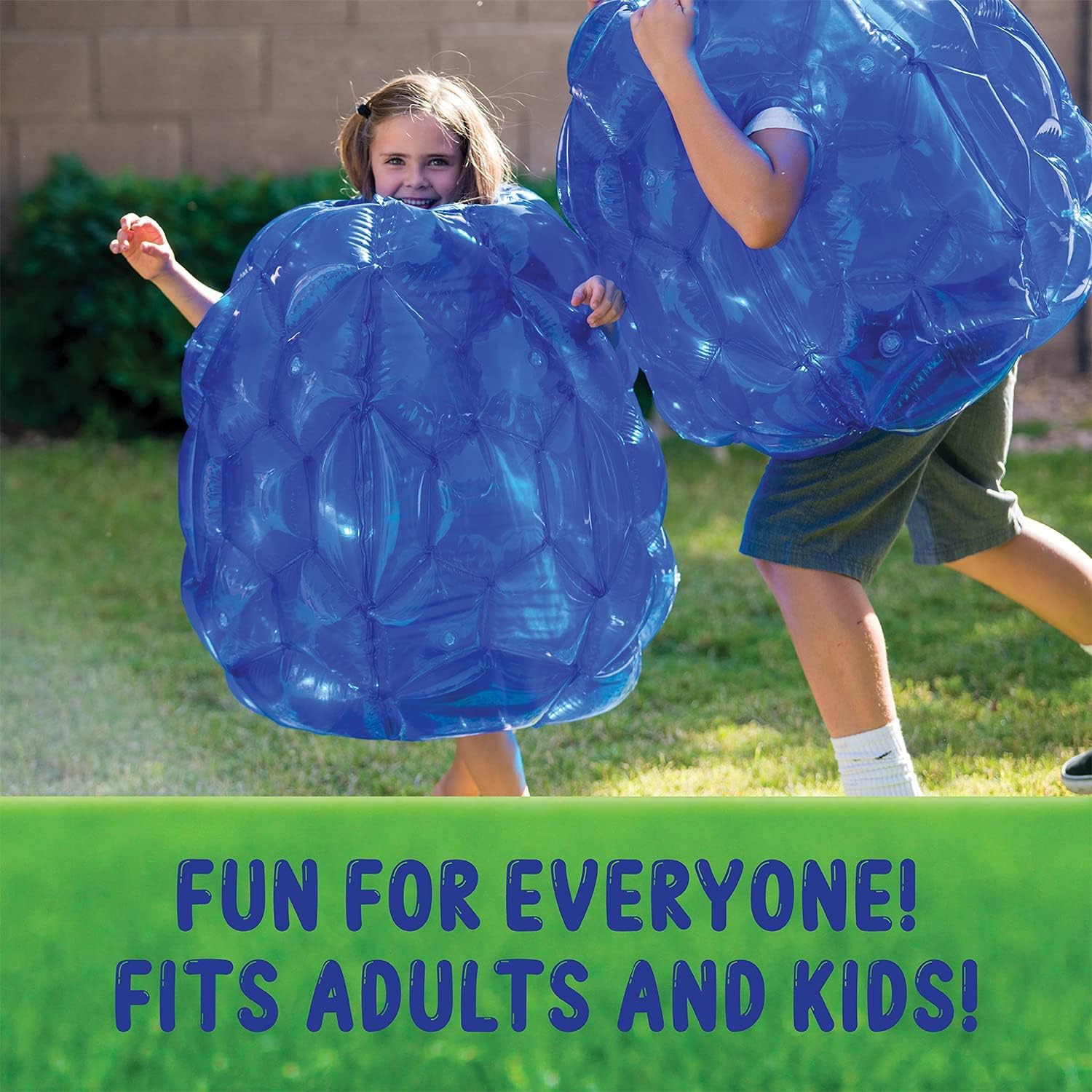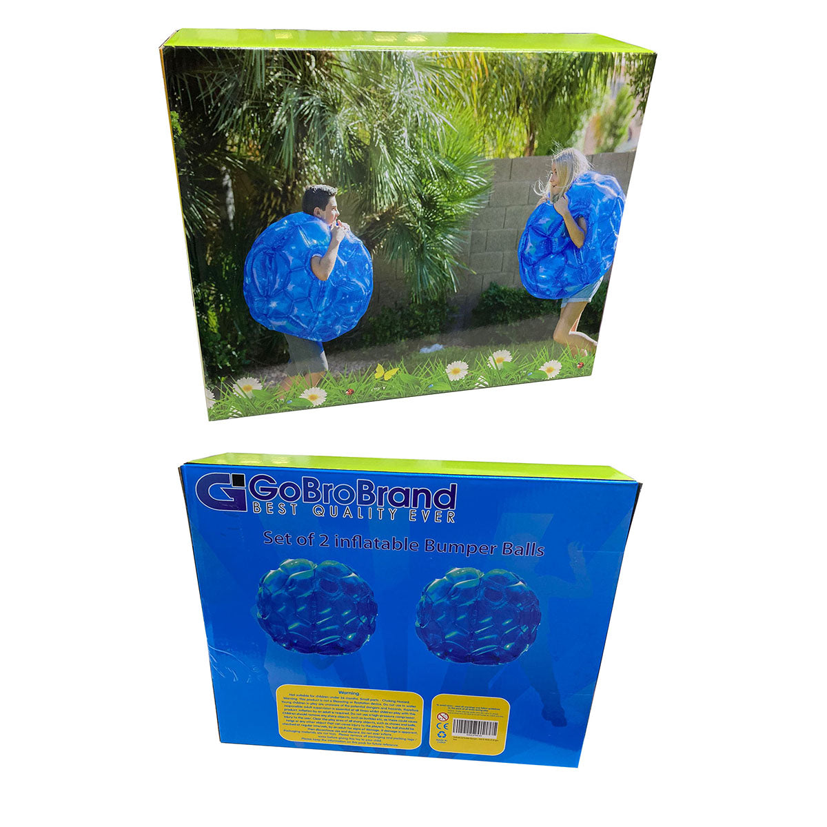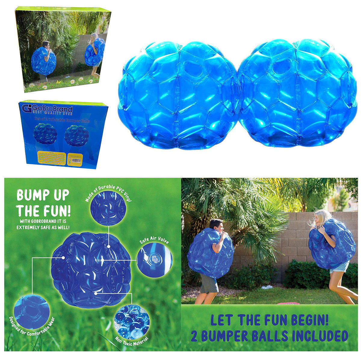 A Two Pack of 36 Inch Heavy Duty wearable Body Bumper Bubble Balls, And a repair kit of 4 hole patches with instructions.