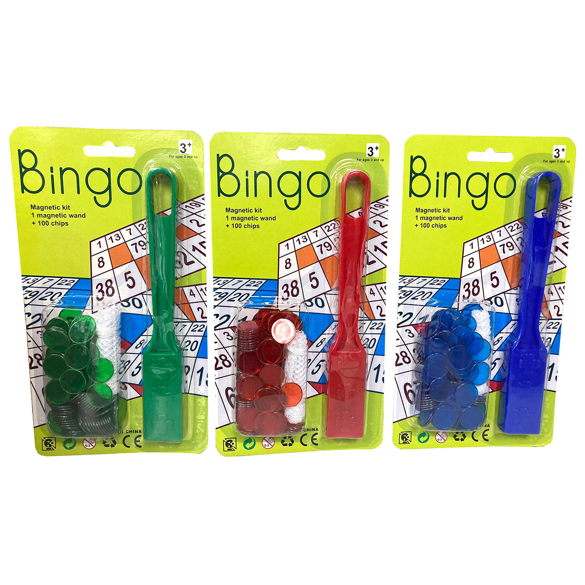 The perfect magnetic bingo wand and chip set for your next bingo game. Each set comes with (1) magnetic bingo wand measuring 7.5" x 1" and 100 magnetic bingo chips with a silver ring embedded in the edge of each chip.