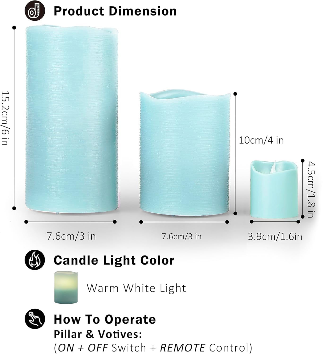 Enjoy carefree candle lights: This set operates on 1 CR2025 battery for the remote, 4 CR2450 batteries for the votives, and 12 AAA batteries for pillars, This LED candle set lets you orchestrate the ambiance from afar with its convenient remote and timer, This product includes a remote control that can be used with 8 candles, and timer operates independently and does not repeat automatically