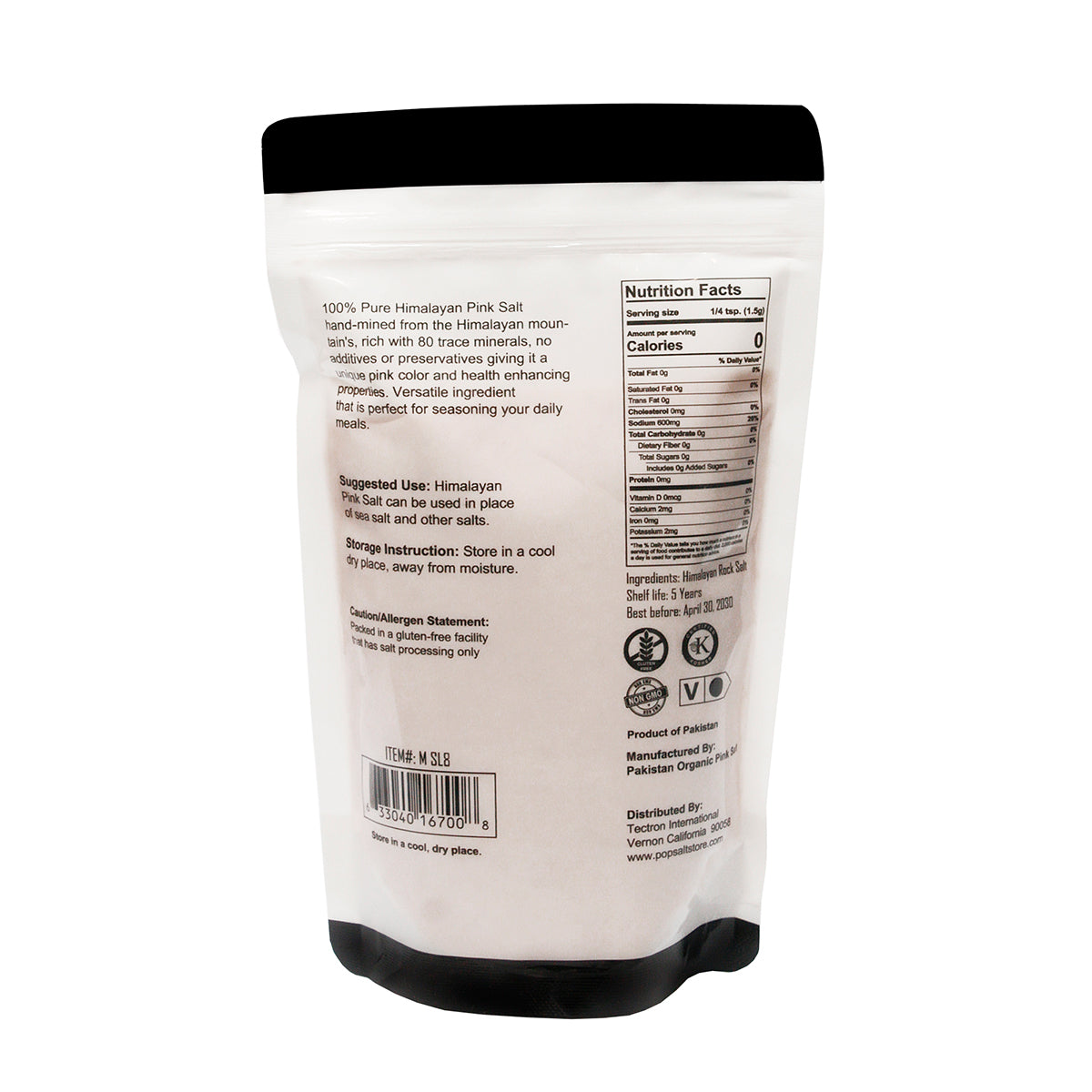 "It's Just Pure“ PopsaltsFine grain size for optimal flavor control on all meats, seafood, salads, chicken and gourmet recipes.Experience the purity of the Himalayas with this certified Kosher and natural Himalayan salt. Harvested by hand, the fine pink salt adds a touch of elegance and taste to any dish. Popsalts brand ensures that you get the finest quality salt that is perfect for culinary uses or for soothing your muscles in a warm bath. One pound pouch of pink fine Himalayan salt is ideal for those who appreciate the finer things in life. The salt is suitable for pantry storage and is a great addition to your food arsenal. Enjoy the natural, unrefined taste of this premium salt that is sure to enhance the flavor of your meals.Popsalts Himalayan salt is mineral rich in flavor,great finishing salt, gourmet salt and a premium salt with balanced flavor. Popsalts is a pure Himalayan all natural and unrefined ancient mineral salt. Mineral content is potassium, calcium and magnesium with 84 trace minerals.
